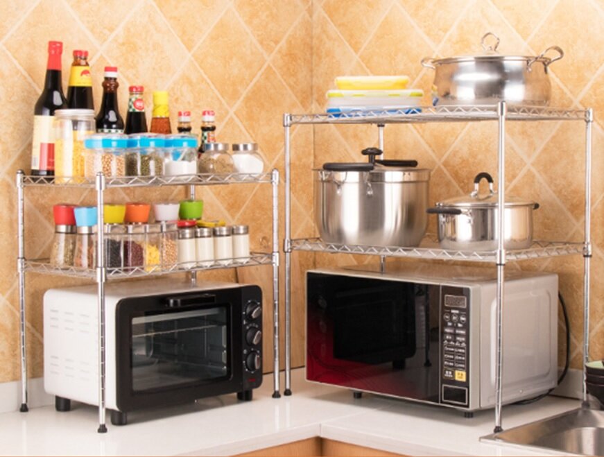Free up some space with this multi-functional microwave storage rack. This convenient unit sits on top of your microwave oven and allows for added storage capacity in an already tight space. The main frame of this rack comprises of a large top surface that is ideal for jars of peanut butter, spices, salt n' pepper shakers, myriads of sauces, e.t.c. This is an all-around kitchen wonder that will save time, energy, and most of all stress levels. Provides extra space for kitchen or bath accessories.
