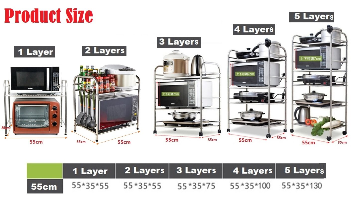 ✅ Layer spacing can be adjusted by 7cm ( 3-5 layers) or adjusted 5cm ( for 2 layers). You can adjust the height and the number of shelves according to the different heights of the kitchen utensils.