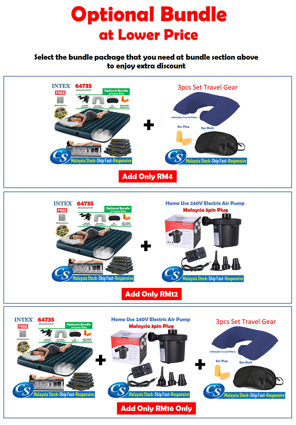 (INTEX 64735 + FREE Repair Patch + Bundle 3pcs Sleeping Set)