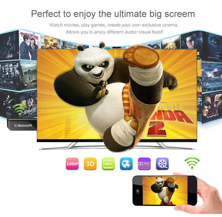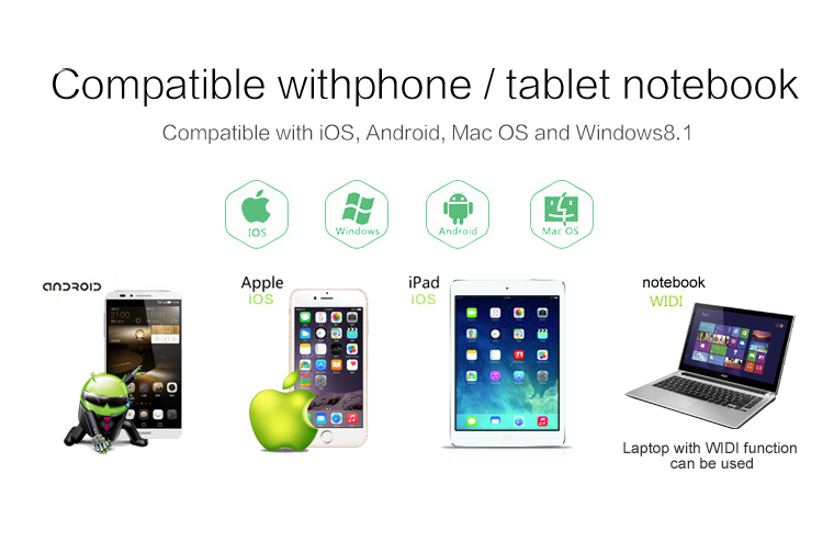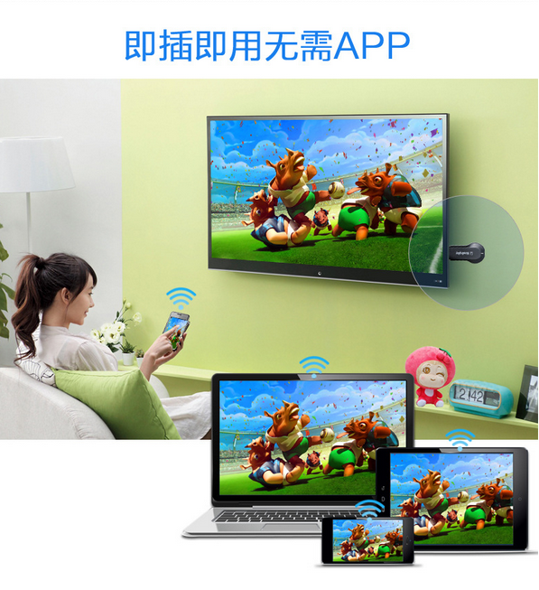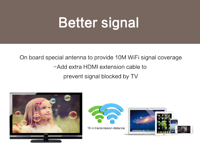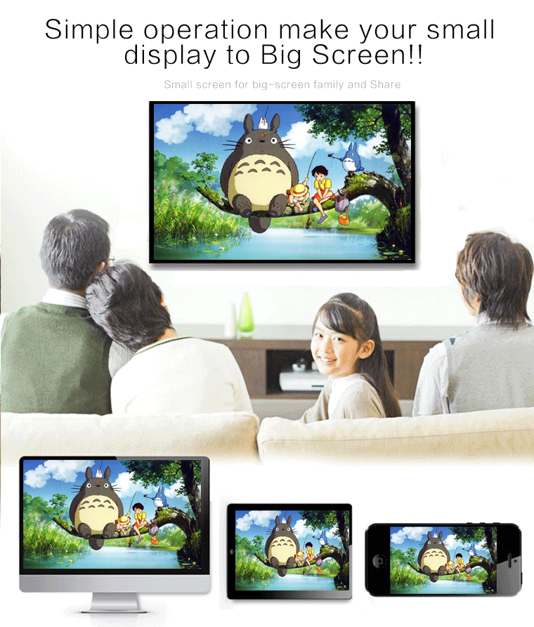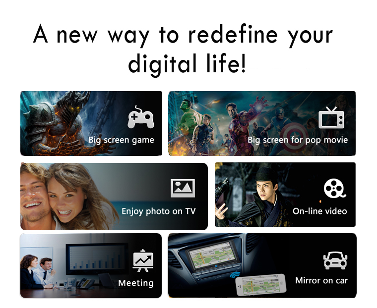 This wifi display dongle receiver applies to LCD/TV/Projector with HDMI interface sharing picture and music of Apple devices as well as picture/video/music of Android smartphones, tablet PCs, notebook, etc. It supports DLNA and AirPlay protocol. Enjoy your video on the big screen!